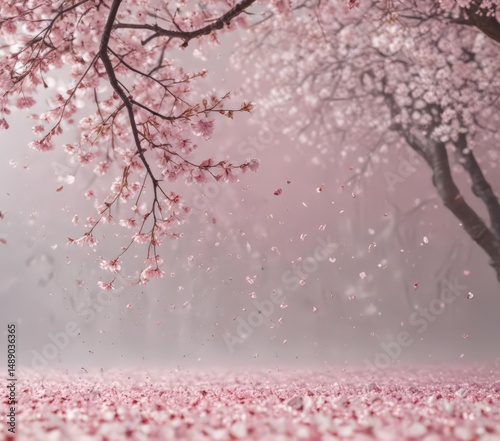 Fototapeta premium Falling sakura petals against a hazy pink and white cherry blossom backdrop ,...
