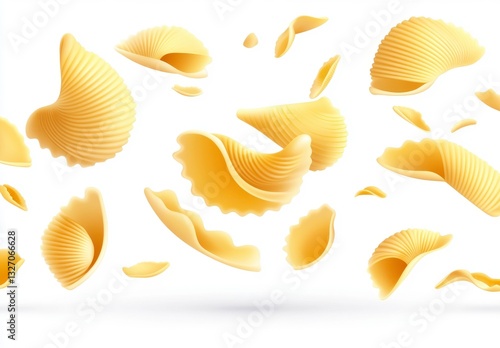 © Yothin, Obraz premium Falling Shell Pasta on White Background