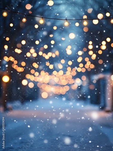 Obraz premium Falling Snow in Winter Street with Bokeh Lights and Holiday Feeling