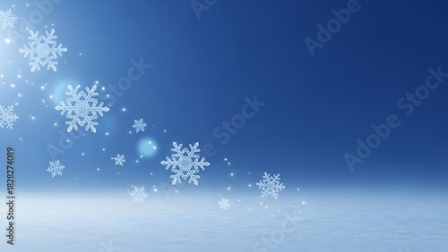 Fototapeta premium Falling snowflakes against a clear blue winter sky with soft light