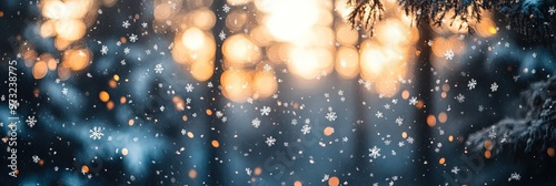 Naklejka premium falling snowflakes in front of blurry snow forest trees