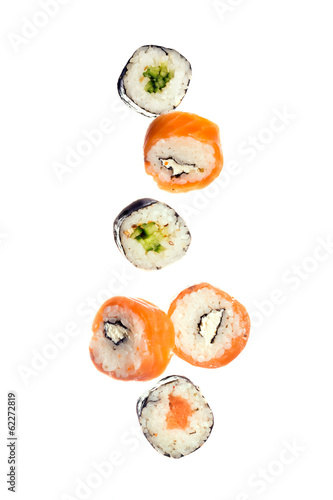 © zakiroff, Fototapeta premium Falling sushi maki rolls