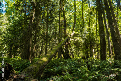 © Yi, Naklejka premium falling tree trunk covered with green mosses laying on the branch of other trees in the forest