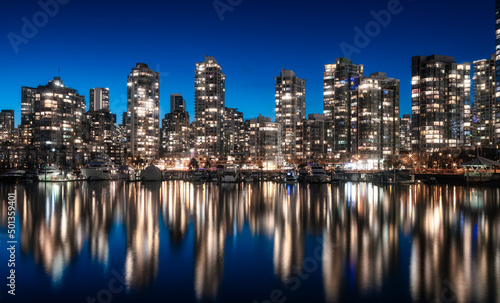 © edb3_16, Fototapeta premium False Creek with modern city buildings at night after sunset. Downtown Vancouver Cityscape, British Columbia, Canada. Panorama