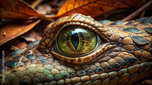 © Danicha, Fototapeta premium False Gharial Eye Closeup - Camouflaged in Dry Leaves, Indonesian Freshwater Crocodile