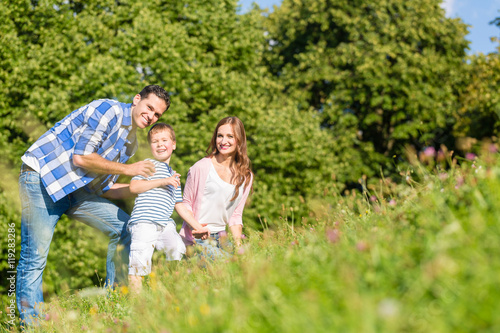 © Kzenon, Fototapeta premium Familie kuschelt gemeinsam auf der Wiese