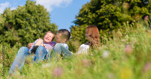 Fototapeta premium Familie kuschelt gemeinsam auf der Wiese