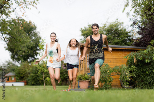 Obraz premium Familie läuft über einen Wassersprenger