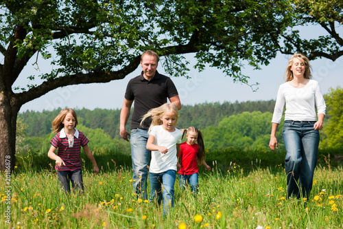 Fototapeta premium Familie rennt über eine Wiese im Frühling