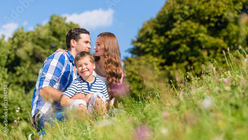 Fototapeta premium Familie sitzt auf der Wiese und das Kind winkt