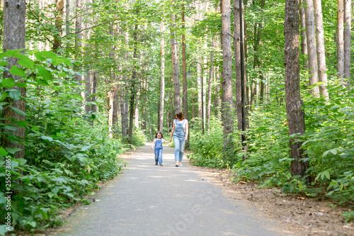 Fototapeta premium Family and nature concept - Portrait of beautiful woman and child girl walking in summer park