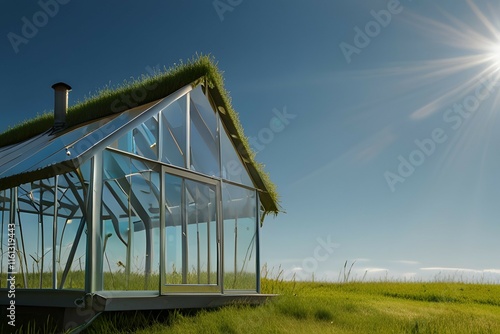 © Mst, Obraz premium Family around green house with solar panels and wind turbine, vertical video