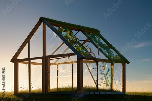 © Mst, Obraz premium Family around green house with solar panels and wind turbine, vertical video