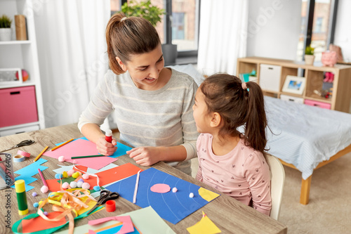 Fototapeta premium family, art and craft concept - mother spending time with her little daughter with glue making applique of color paper at home