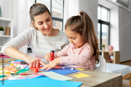 Fototapeta premium family, art and craft concept - mother spending time with her little daughter with glue making applique of color paper at home