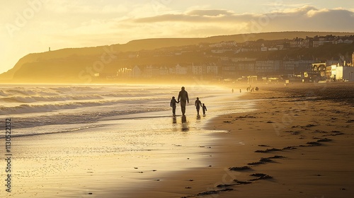 © worapong, Naklejka premium Family Bonding on Serene Beach at Sunset with Gentle Waves