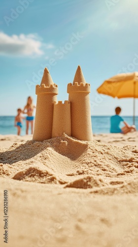 Naklejka premium Family builds sandcastles on sunlit beach travel experiences playful...