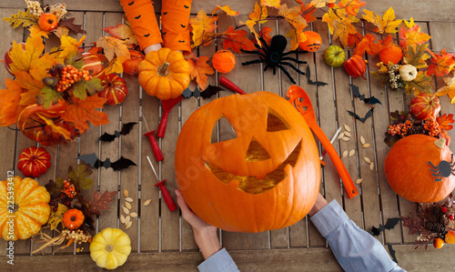 Fototapeta premium Family carving pumpkin. Halloween trick or treat
