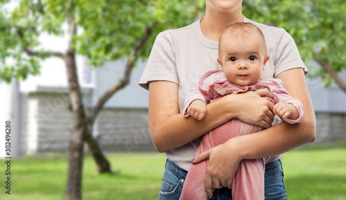 © Syda Productions, Fototapeta premium family, child and parenthood concept - happy smiling young mother holding little baby daughter over summer garden or home yard background