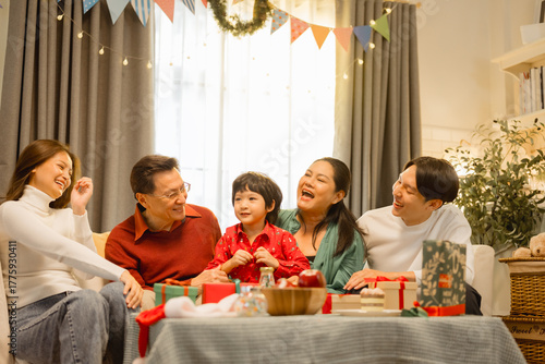 Obraz premium family, christmas, happy family, families, Happy Asian family celebrating Christmas at home, surrounded by gifts and decorations, enjoying laughter, love, and joyful holiday moments together.