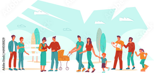 © Мария Гисина, Naklejka premium Family couples with children walking. City park with walking people. Decorative banner element.