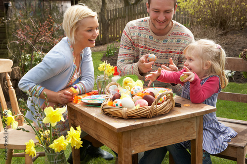 © micromonkey, Fototapeta premium Family Decorating Easter Eggs On Table Outdoors