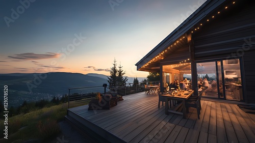 Fototapeta premium Family dinner on a mountaintop deck at sunset.