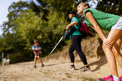 © Nikola Spasenoski, Fototapeta premium Family Enjoying a Refreshing Hiking Trail Adventure on a Summer Day