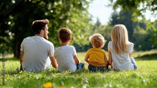 © Inlovehem, Fototapeta premium Family enjoying a sunny day outdoors, sitting together on the grass.