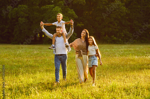 © Studio Romantic, Fototapeta premium Family enjoying summer weekend and spending time in nature. Happy mother, father and little children walking on a grassy meadow in a beautiful green park on a nice sunny evening