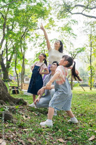 © Timeimage, Fototapeta premium Family enjoys a sunny day outdoors, watching something exciting in the sky near a park surrounded by green trees