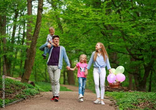 © okostia, Obraz premium Family father and mother with two kids walking in summer green city park on picnic, happy holidays parents and children on nature