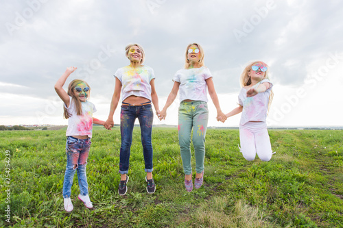 © satura_, Fototapeta premium Family, festival of holi and holidays concept - portrait of happy family covered in paint