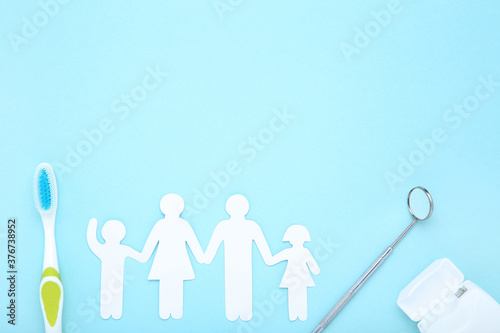 Obraz premium Family figures with toothbrush and mirror on blue background
