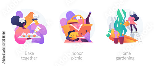 © Visual Generation, Naklejka premium Family fun during quarantine abstract concept vector illustration set. Bake together, indoor picnic, home gardening, baking with children, eco gardening, indoor activities ideas abstract metaphor.