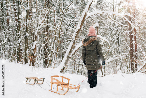 © Filip Olejowski, Naklejka premium family fun in winter on a sled in the forest