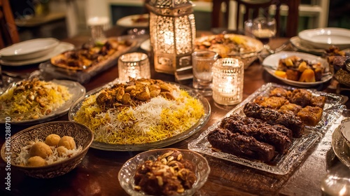 Fototapeta premium Family gathered around a festive Eid dinner table with biryani, kebabs, and traditional sweets under warm cozy lighting