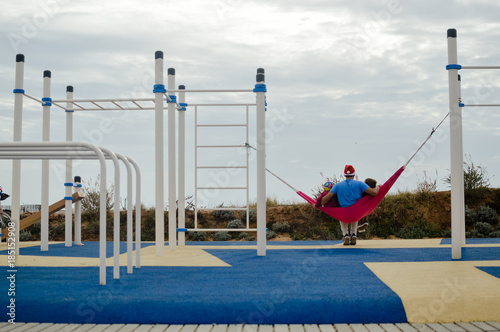 Naklejka premium Family having fun lying on hammock in outdoors garden background. Back view...