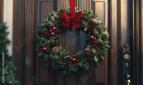 Naklejka premium Family holiday wreath hanging on a beautifully decorated front door
