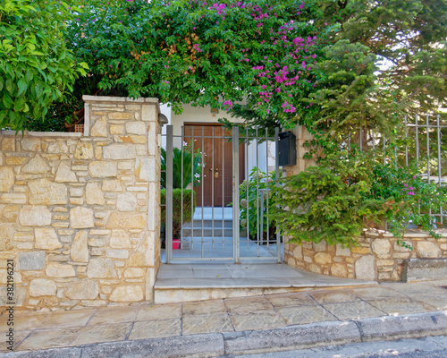 © Dimitrios, Fototapeta premium family house front entrance natural wood door and garden