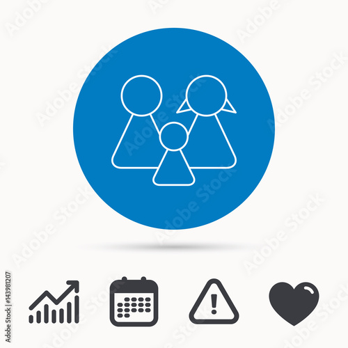Fototapeta premium Family icon. Male, female and child sign. Calendar, attention sign and growth chart. Button with web icon. Vector