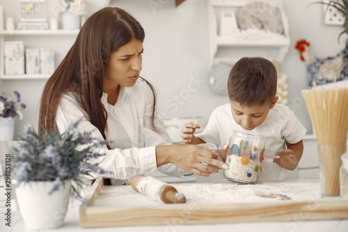 Fototapeta premium Family in a kitchen. Beautiful mother with little son. Flour at the table