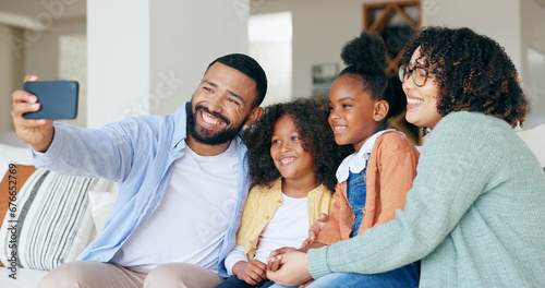 Fototapeta premium Family in fun selfie with kids on sofa, bonding together for love and memory in home. Photography, happy face and parents with girl children in living room with smile, relax with mother and father.