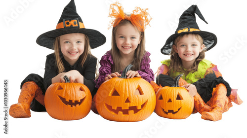 © Elchin Abilov, Fototapeta premium Family in Halloween costumes and with pumpkins on transparent background