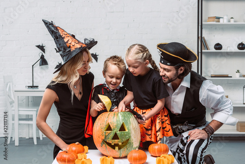 Fototapeta premium family in various halloween costumes at table with pumpkins in kitchen at home