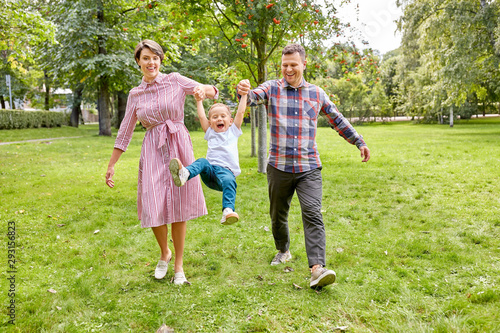 Obraz premium family, leisure and people concept - happy mother, father and little son having fun at summer park