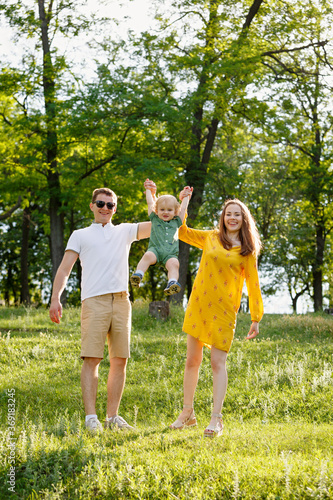 © jonnyslav, Fototapeta premium Family life. Parents play with their son on background of nature. Happy family leisure outdoors.