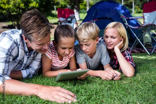 Fototapeta premium Family lying on grass and using digital tablet