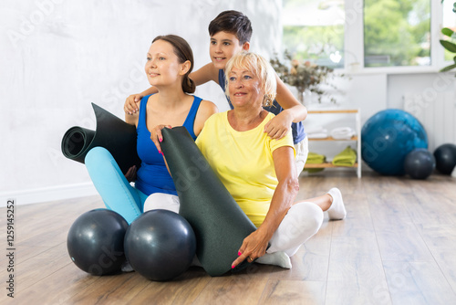 Obraz premium Family: mother, son and grandmother are happy after successful yoga training