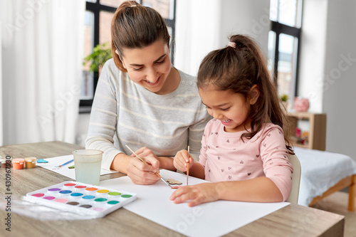 © Syda Productions, Fototapeta premium family, motherhood and leisure concept - mother spending time with her little daughter with colors painting chipboard items at home